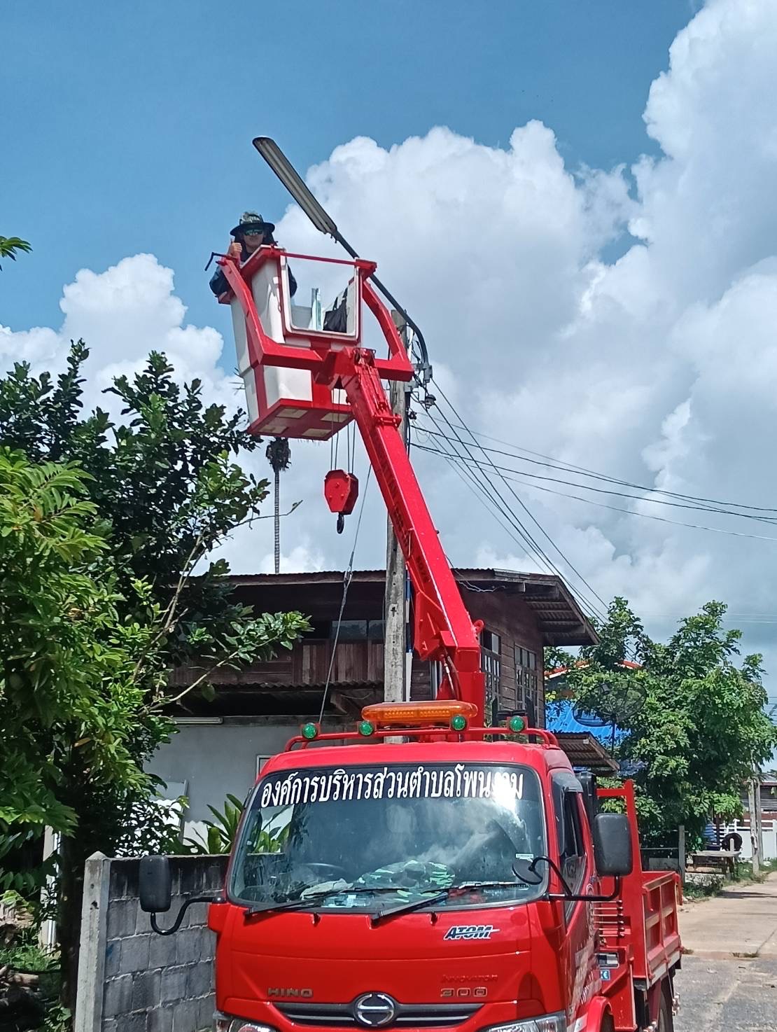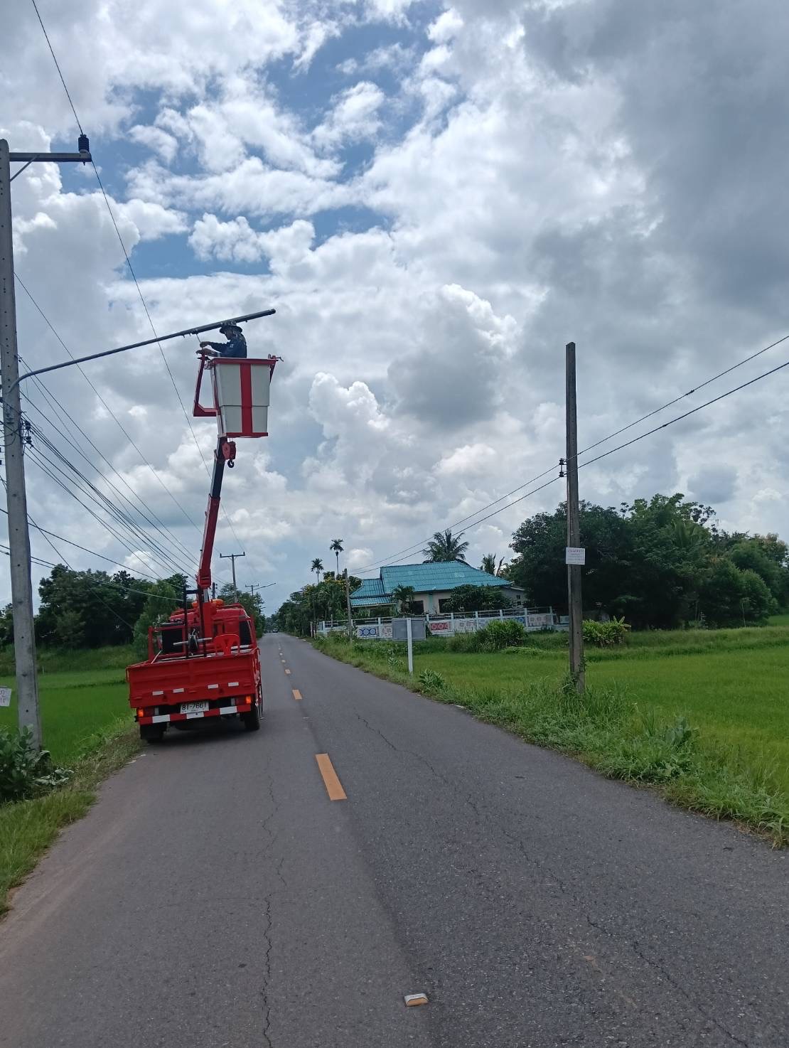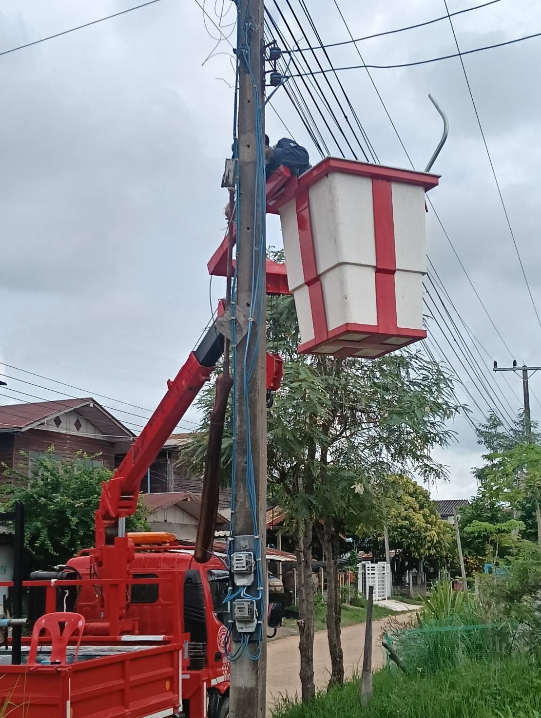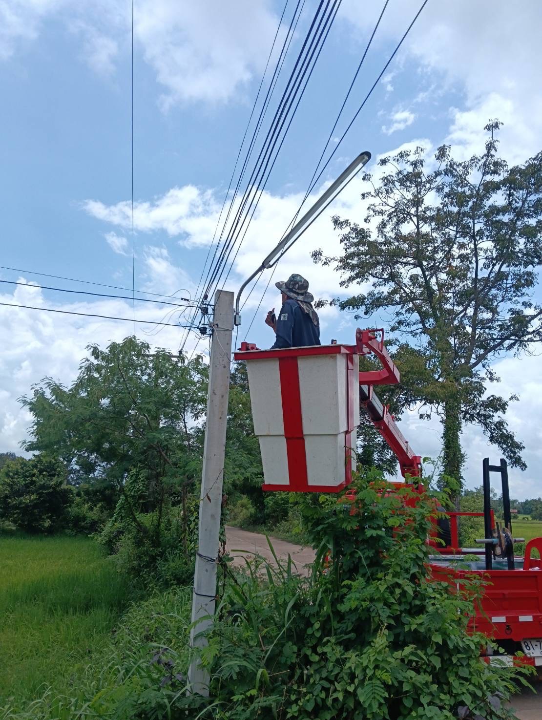 เจ้าหน้าที่งานซ่อมบำรุงไฟฟ้า กองช่าง ลงพื้นที่เดินสายดับเและติดตั้งโคมไฟส่องสว่าง(เพิ่มเติม) พร้อมตัดแต่งกิ่งไม้พันสายไฟ เพื่อป้องกันอันตรายที่อาจเกิดจากสายไฟฉีดขาด ในเขตพื้นที่บ้านหนองแซง หมู่ที่ 15 ตำบลโพนงาม อำเภอกุดชุม จังหวัดยโสธร