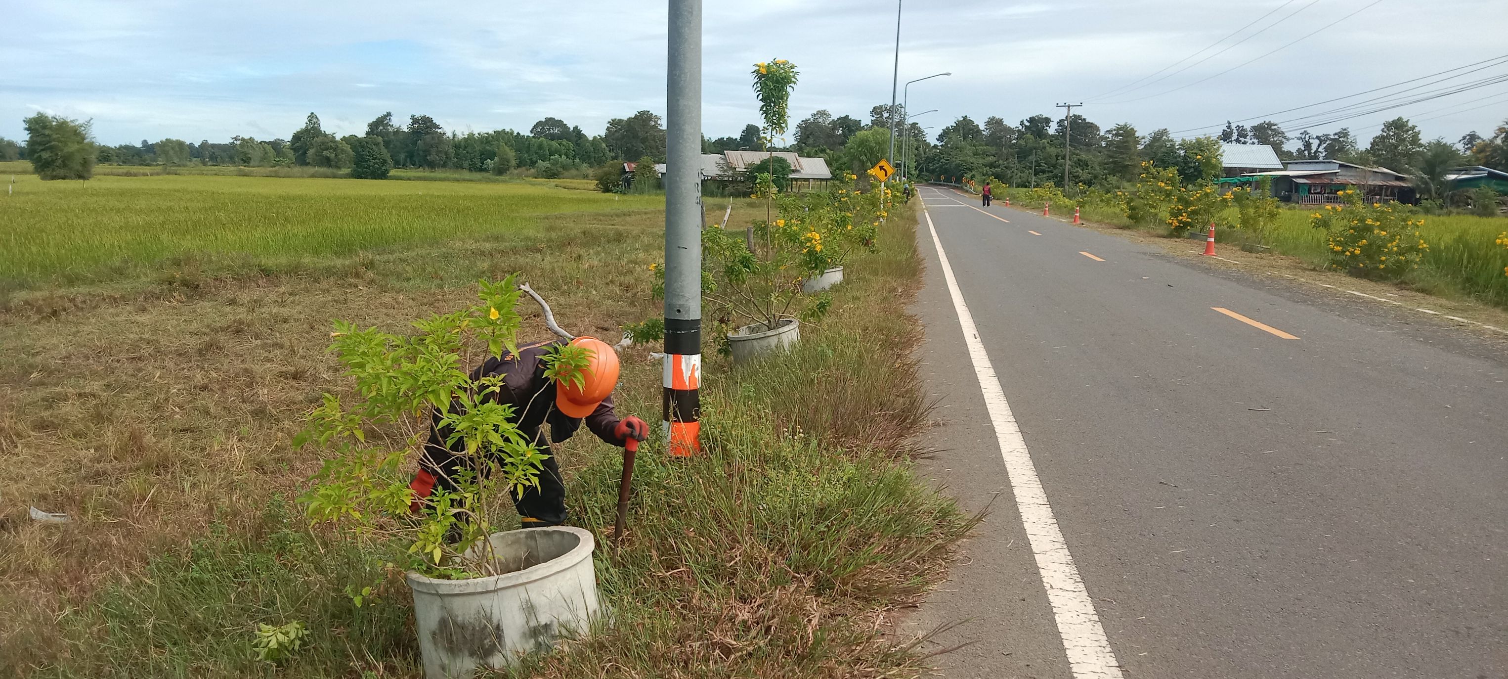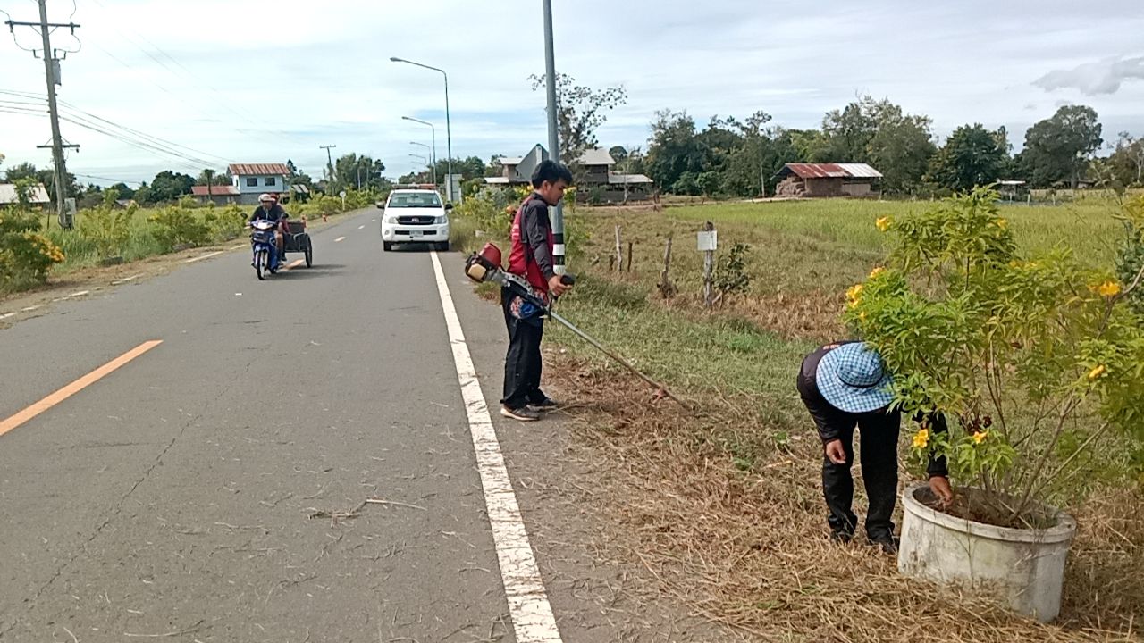 งานป้องกันและบรรเทาสาธาณภัย ลงพื้นที่ปรับปรุงภูมิทัศน์ตัดหญ้าข้างทางถนนเส้นบ้านโพนงาม - อบต.โพนงาม