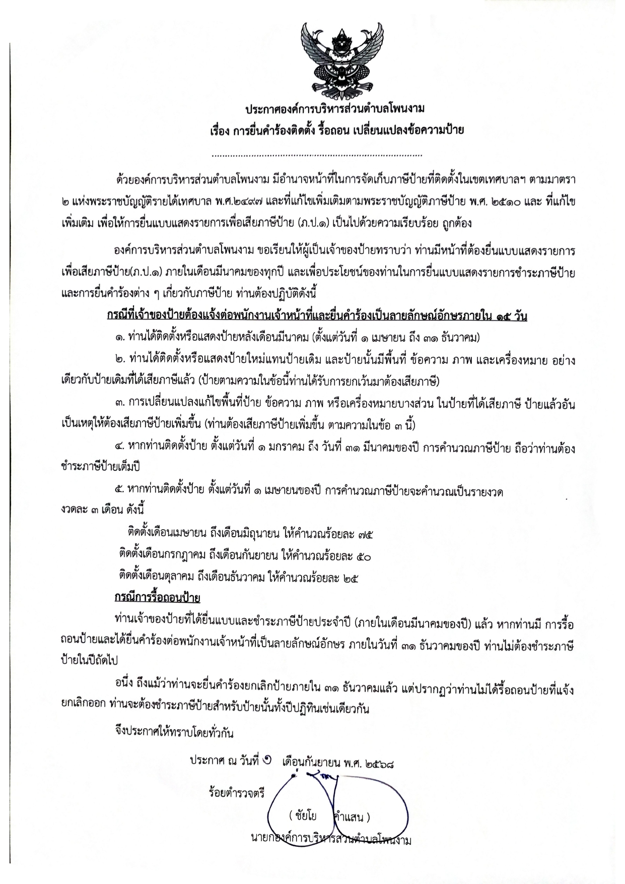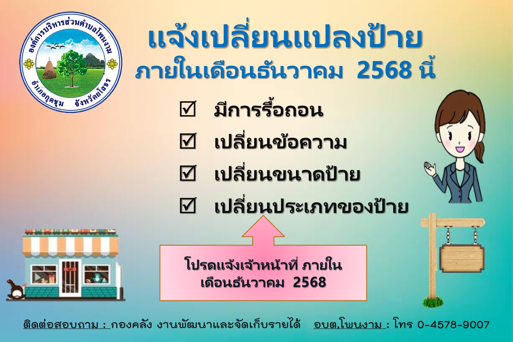 ประชาสัมพันธ์ การยื่นคำร้องติดตั้ง รื้อถอน เปลี่ยนแปลงข้อความป้าย