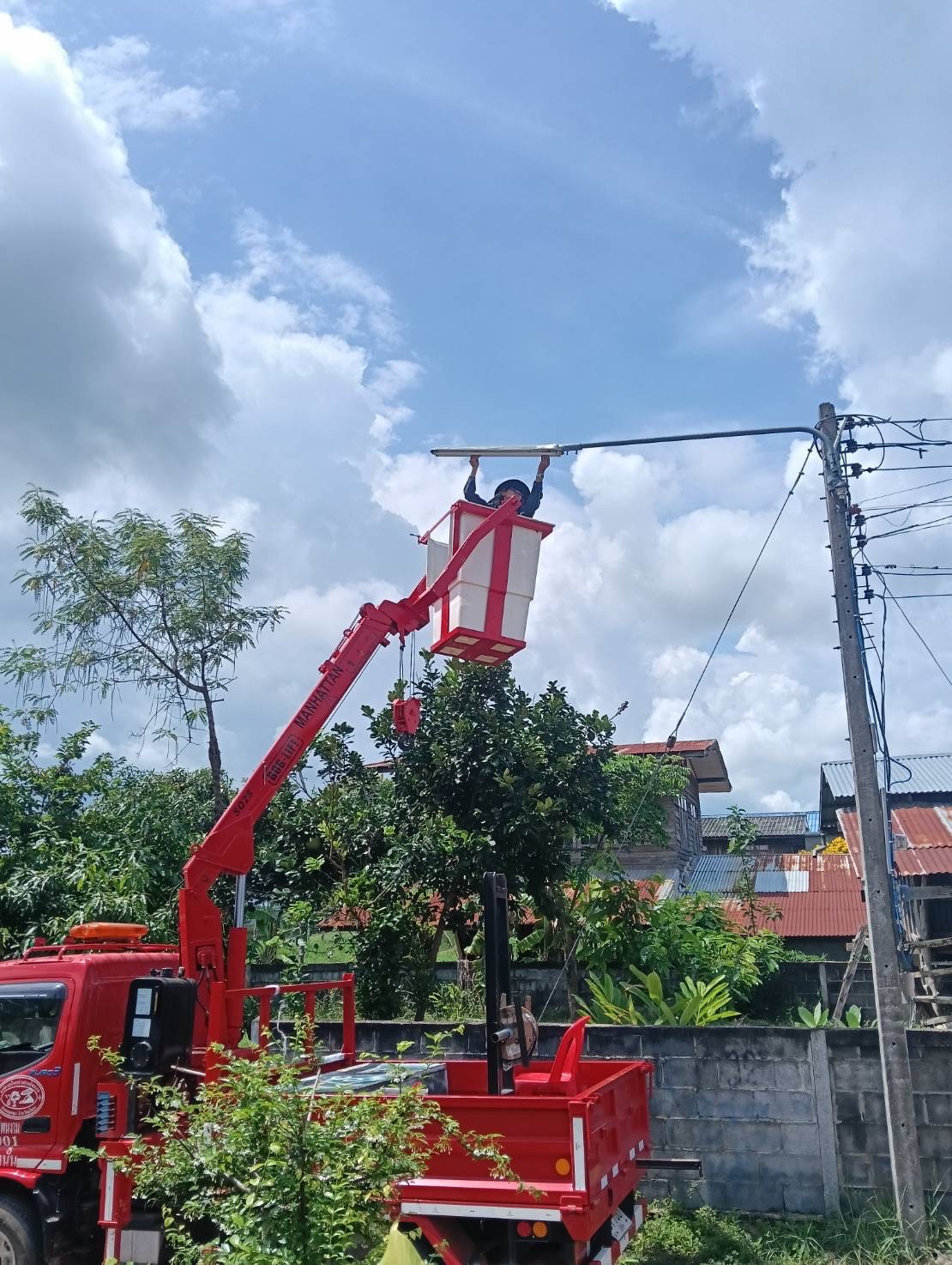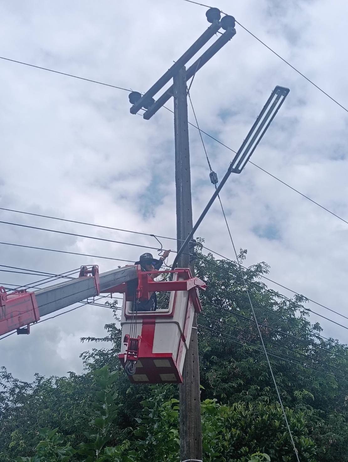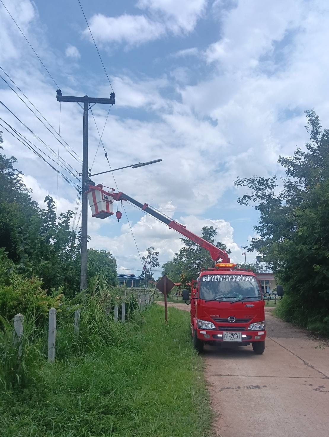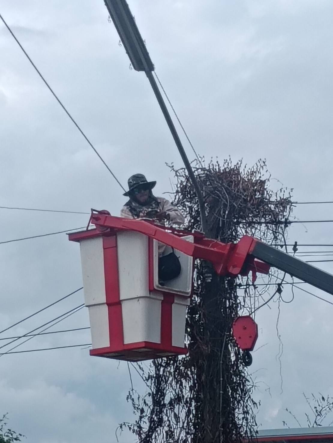 เจ้าหน้าที่งานซ่อมบำรุงไฟฟ้า กองช่าง ลงพื้นที่เดินสายดับเและติดตั้งโคมไฟส่องสว่าง(เพิ่มเติม) พร้อมตัดแต่งกิ่งไม้พันสายไฟ เพื่อป้องกันอันตรายที่อาจเกิดจากสายไฟฉีดขาด ในเขตพื้นที่บ้านหนองแซง หมู่ที่ 15 ตำบลโพนงาม อำเภอกุดชุม จังหวัดยโสธร