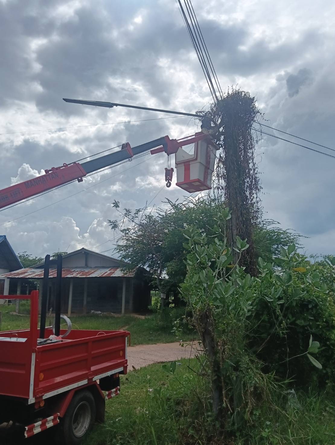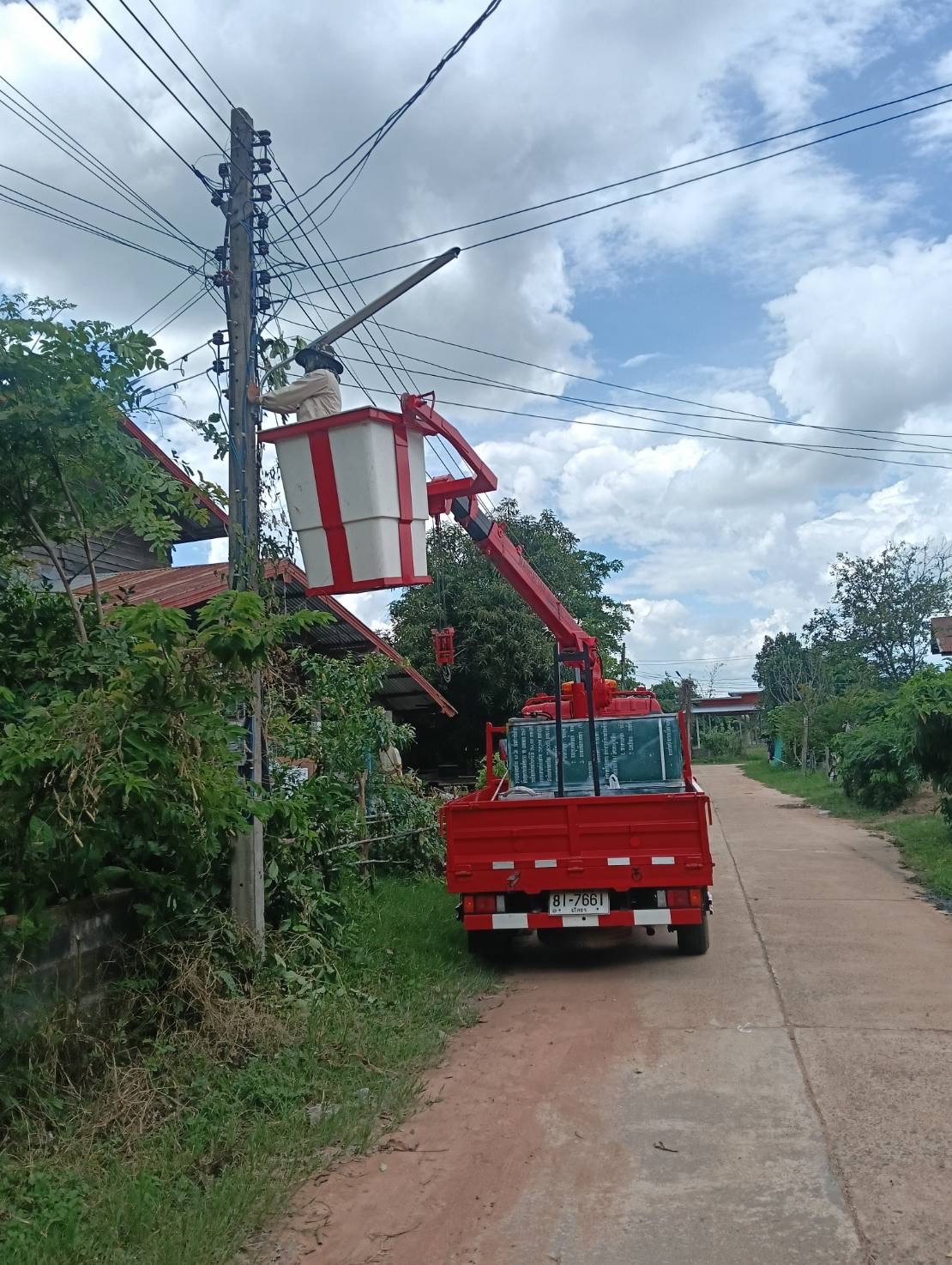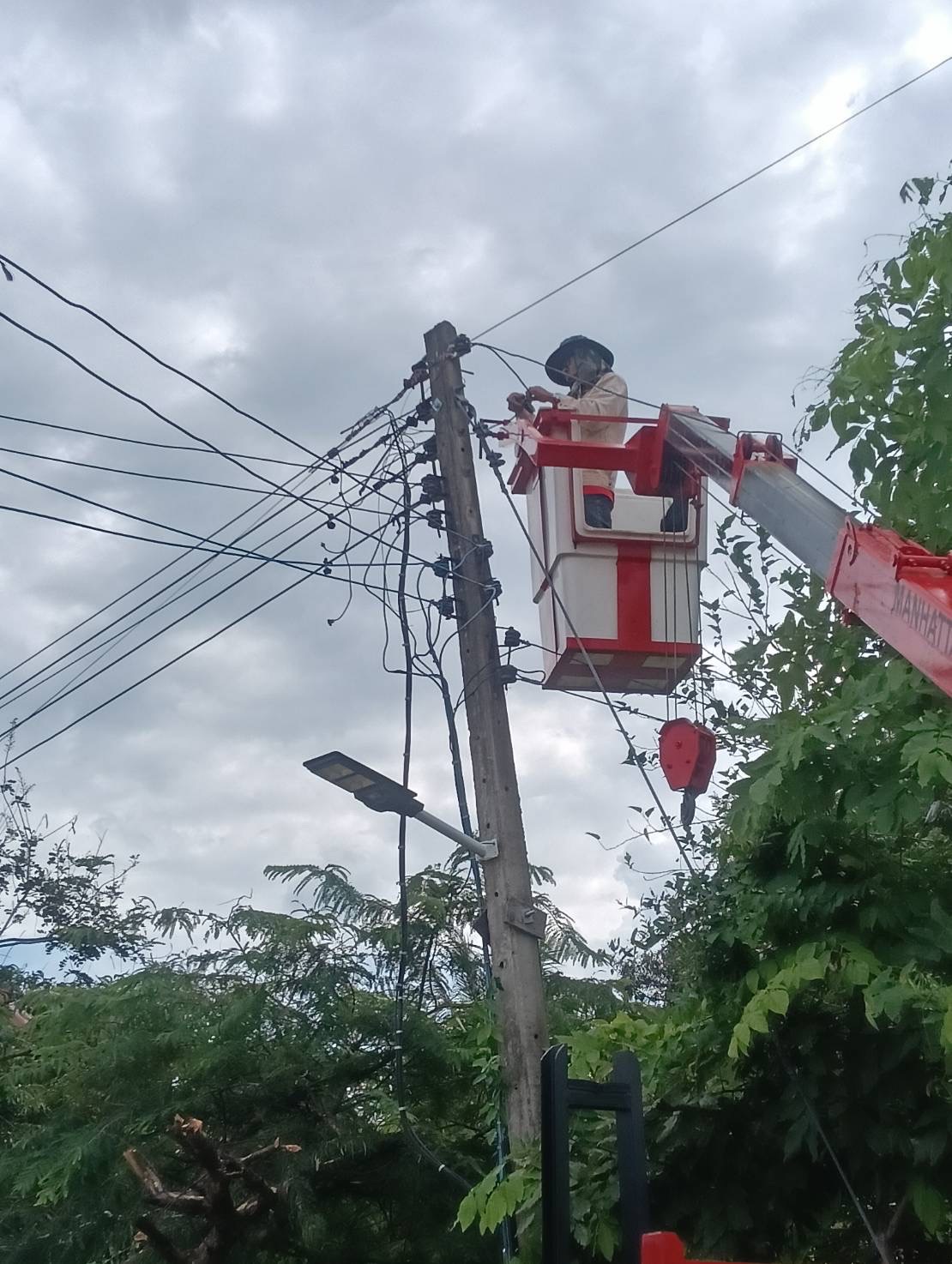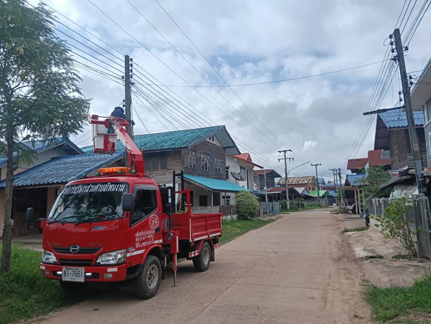 เจ้าหน้าที่งานซ่อมบำรุงไฟฟ้า กองช่าง ลงพื้นที่เดินสายดับเและติดตั้งโคมไฟส่องสว่าง(เพิ่มเติม) พร้อมตัดแต่งกิ่งไม้พันสายไฟ เพื่อป้องกันอันตรายที่อาจเกิดจากสายไฟฉีดขาด ในเขตพื้นที่บ้านหนองแซง หมู่ที่ 15 ตำบลโพนงาม อำเภอกุดชุม จังหวัดยโสธร