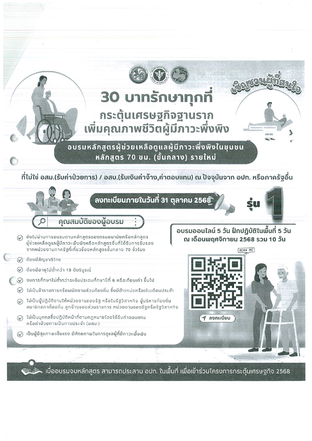 ประชาสัมพันธ์ ขอเชิญชวนผู้ที่สนใจอบรมหลักสูตรผู้ช่วยเหลือดูแลผู้มีภาวะพึ่งพิงในชุมชนหลักสูตร 70 ซม. (ชั้นกลาง) รายใหม่